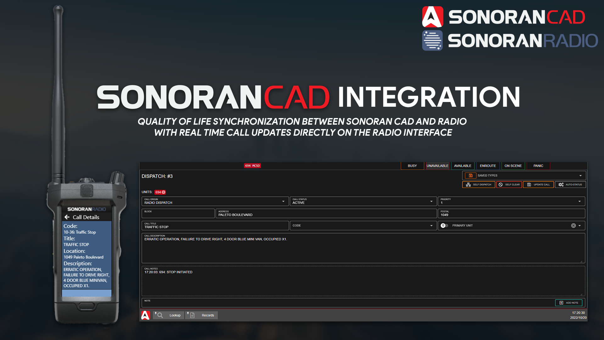 This submodule allows Sonoran Radio customers to connect the radio with the Sonoran CAD. View your unit status, dispatch call information, toggle a panic, and more!