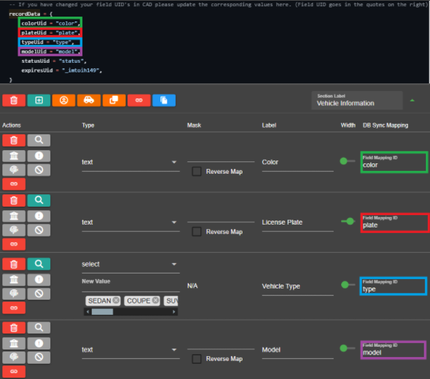 When a player registers a vehicle in-game, the submodule must know what fields in your custom vehicle registration to enter the vehicle information into. The `recordData` portion of the config contains the `Field Mapping ID` for the default vehicle record template.
