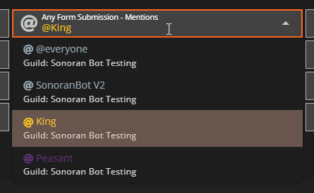 In the middle drop down menu you can select any roles you would like to be mentioned in the webhook. You can select as many roles as you wish and this will mention these roles at the beginning of the message.