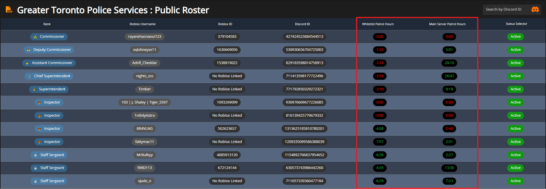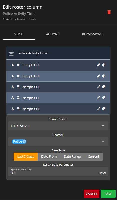 The ER:LC panel extends functionality to [CMS rosters](https://docs.sonoransoftware.com/cms/tutorials/rosters/creating-custom-rosters) by allowing you to add an `Activity Tracker Hours` column that automatically displays each user’s in-game time over a configurable period. This column can also be configured to track time spent on specific ER:LC team(s).