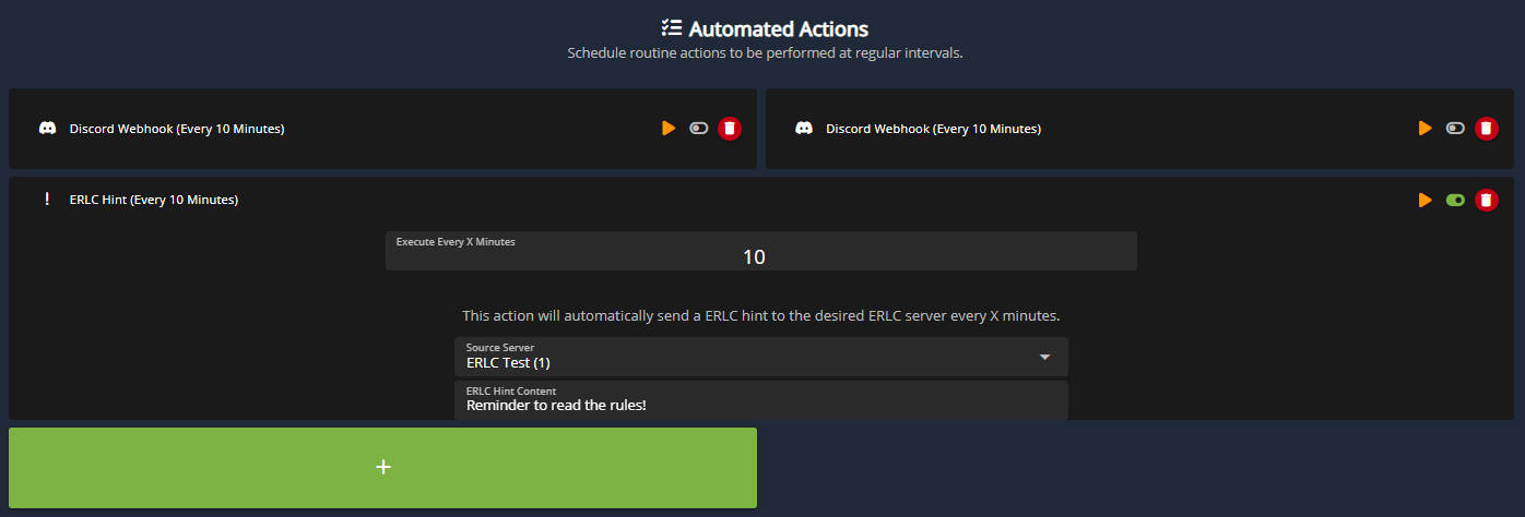 The [CMS Actions panel](https://docs.sonoransoftware.com/cms/tutorials/administrative/actions) performs routine actions at custom intervals. This panel integrates with the ER:LC panel to offer automated in-game hints and notifications.
