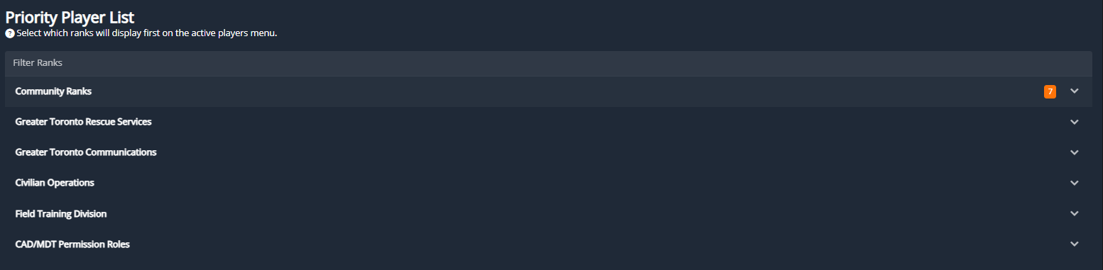 The Priority Player List highlights in-game users with specific CMS ranks by moving them to the top of the player list. This is useful for quickly identifying which staff members (or other ranks) are currently online.