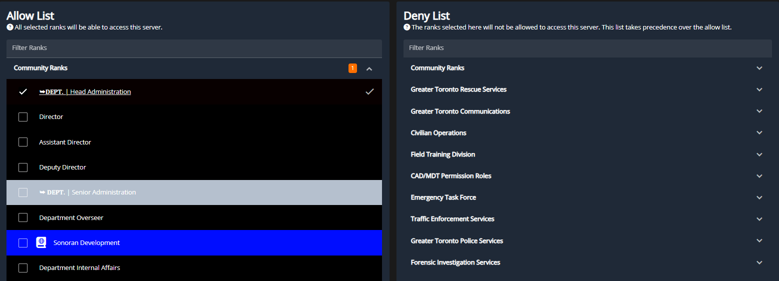 The allow and deny lists let you control game access based on CMS ranks. These lists are activated once one or more ranks are configured.