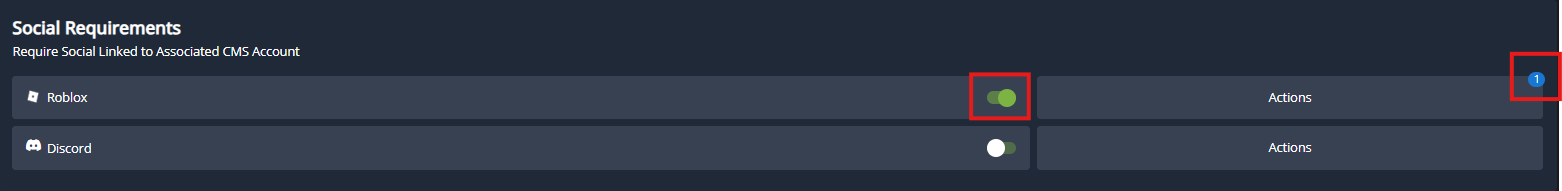 The `Social Requirements` section allows you to require that CMS accounts be linked to both Discord and Roblox accounts. When users have both social accounts connected, the ER:LC panel and Discord integrations can operate with full functionality.