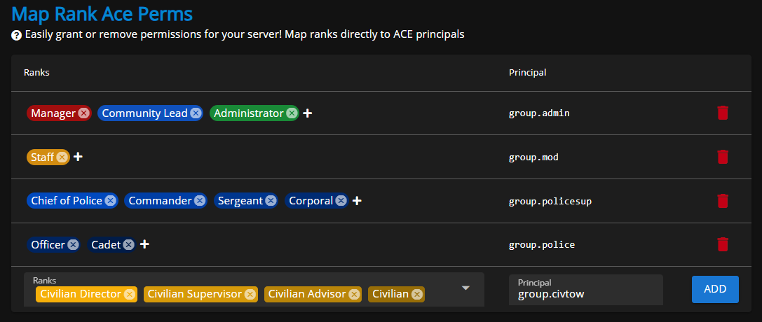 You can select the ranks you would like and input the principal identifier you would like to grant them. This makes it easy to grant users in-game permissions en masse.