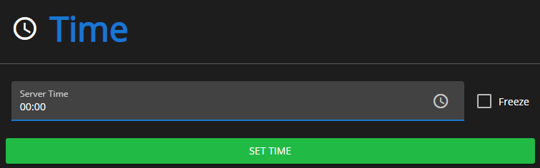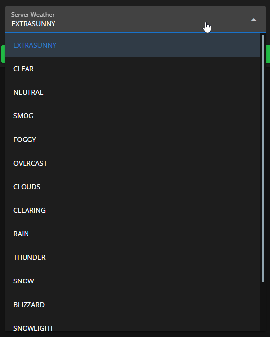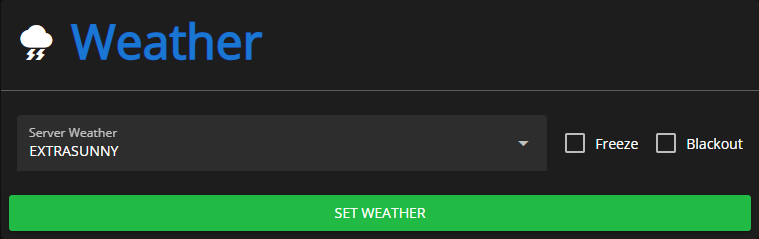 Here you can set the current weather on your server. Open the dropdown menu and choose from 15 different weather options! You can also toggle `Freeze` and `Blackout` on the side.