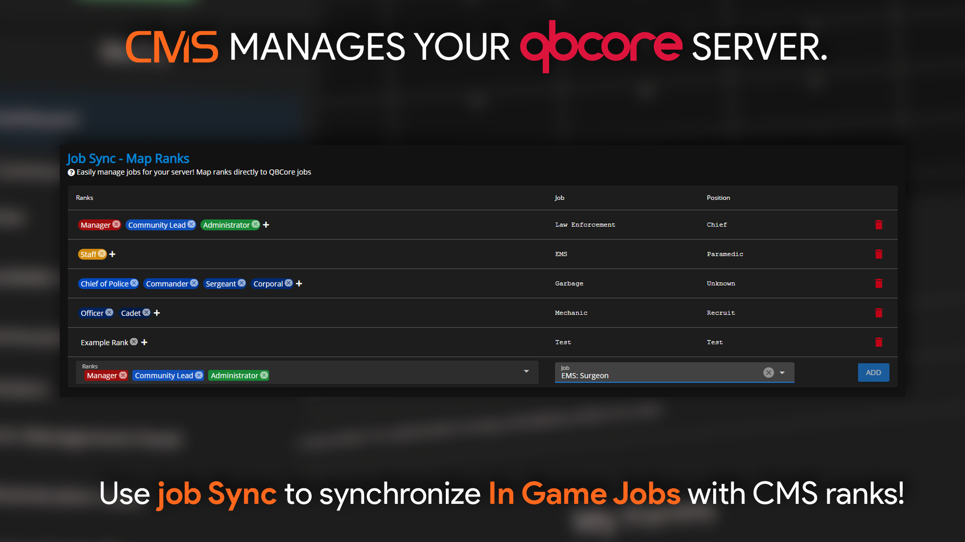When a player has the job in-game, they will be granted the associated CMS ranks. This allows you to restrict permissions for Sonoran CAD, Radio, etc. to specific character jobs only.
