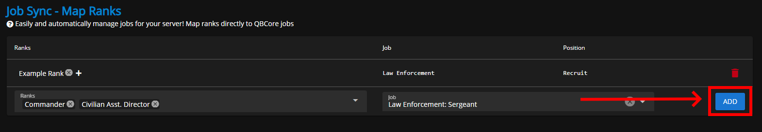 Click `ADD` to add that mapping to the Job Sync list. Repeat for however many jobs you need to sync. If needed, you can delete a mapping with the red trash button on the right.