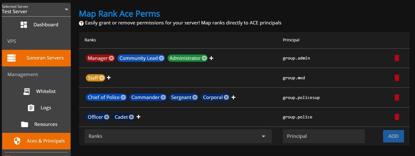 Navigate to either game panel's within your Sonoran CMS community and open up the Aces & Principals tab.