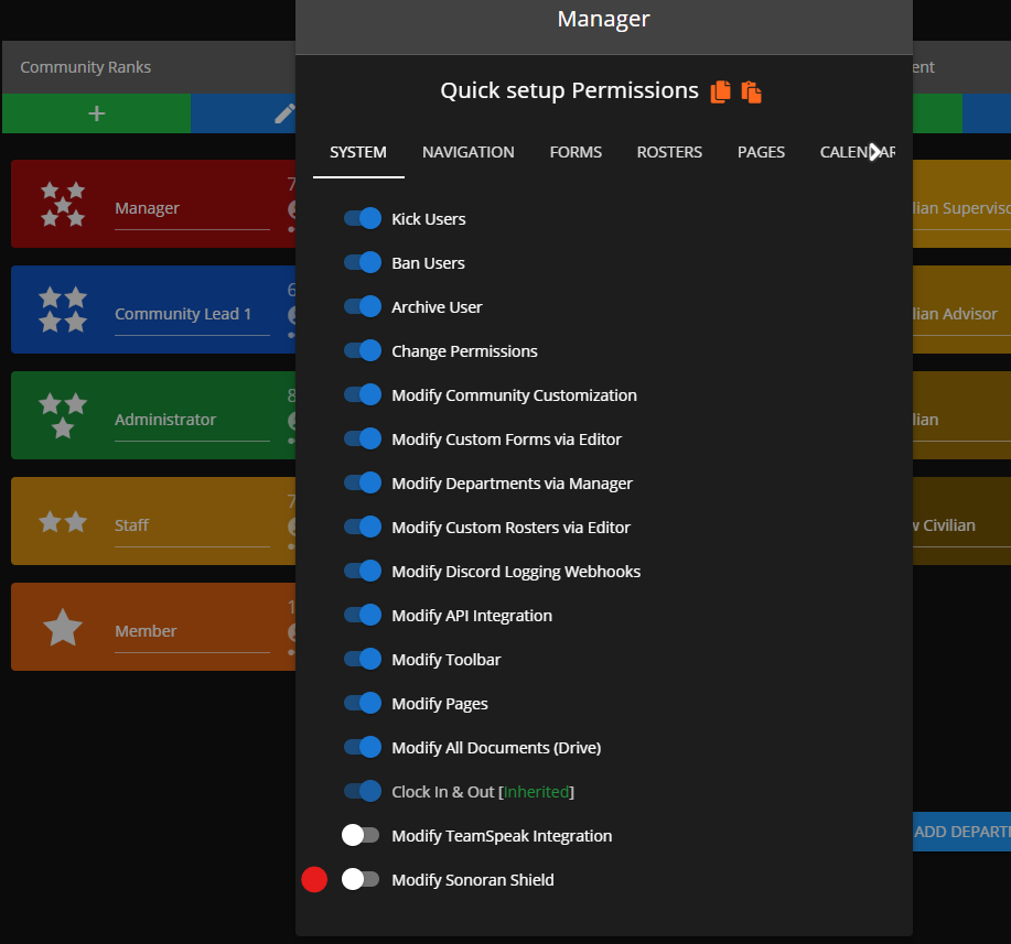 In the [rank manager](https://docs.sonoransoftware.com/cms/tutorials/user-management/creating-departments), their role will need the `Modify Sonoran Shield` permission under the `System` tab.