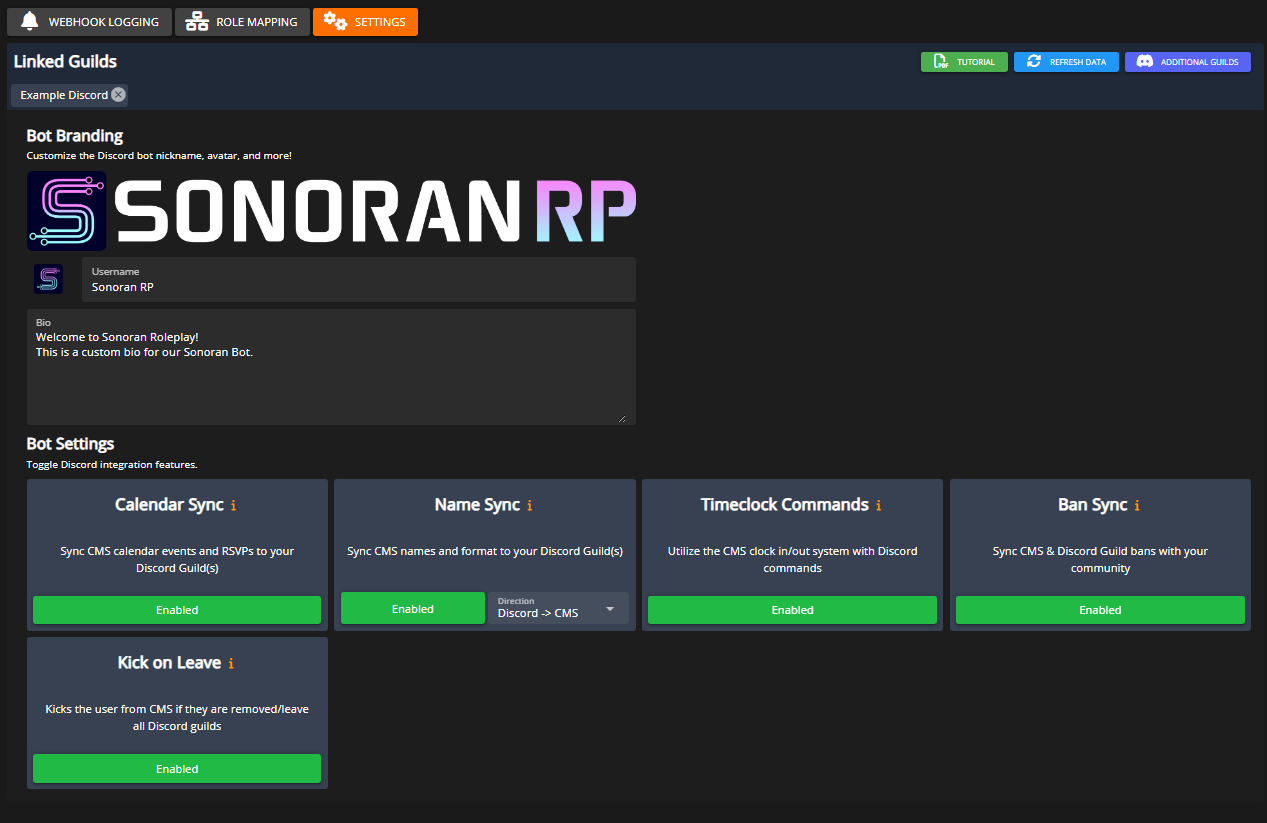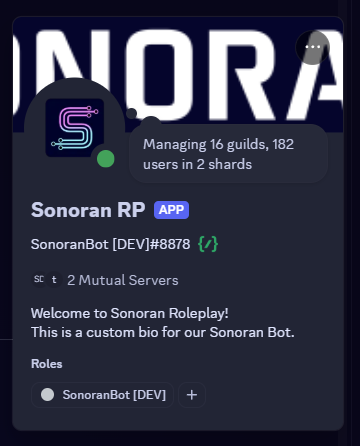 The Sonoran Discord Bot can have a [custom avatar, nickname, banner image, and bio](https://app.gitbook.com/u/ktd3UN62W3TRmYyiu3UYjdC4Qfp1)! These can be customized in the CMS Discord Integration's Settings panel.