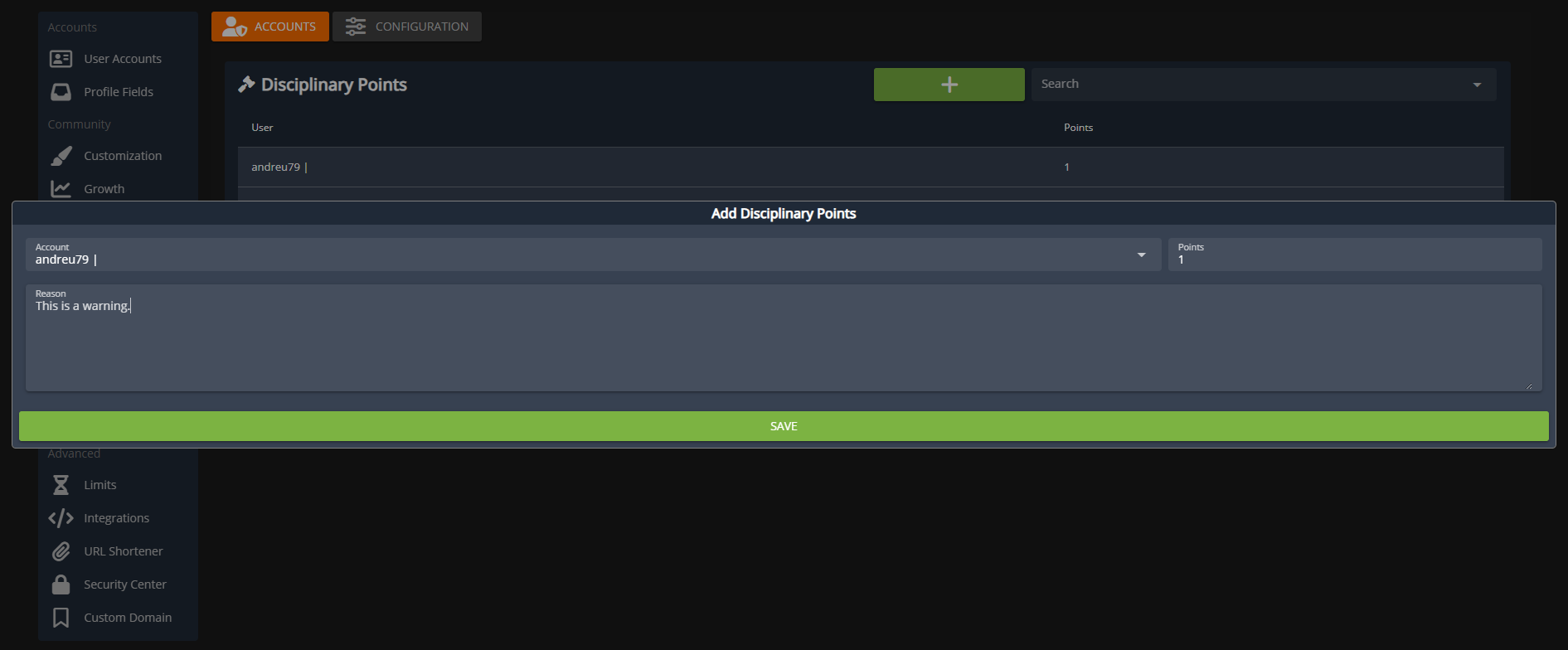 This panel allows you manage disciplinary "points" to a user when they break the rules, misbehave, etc. Additionally, you can configure automated actions like sending the user an email, Discord message, modifying their ranks, banning them from the community, etc.