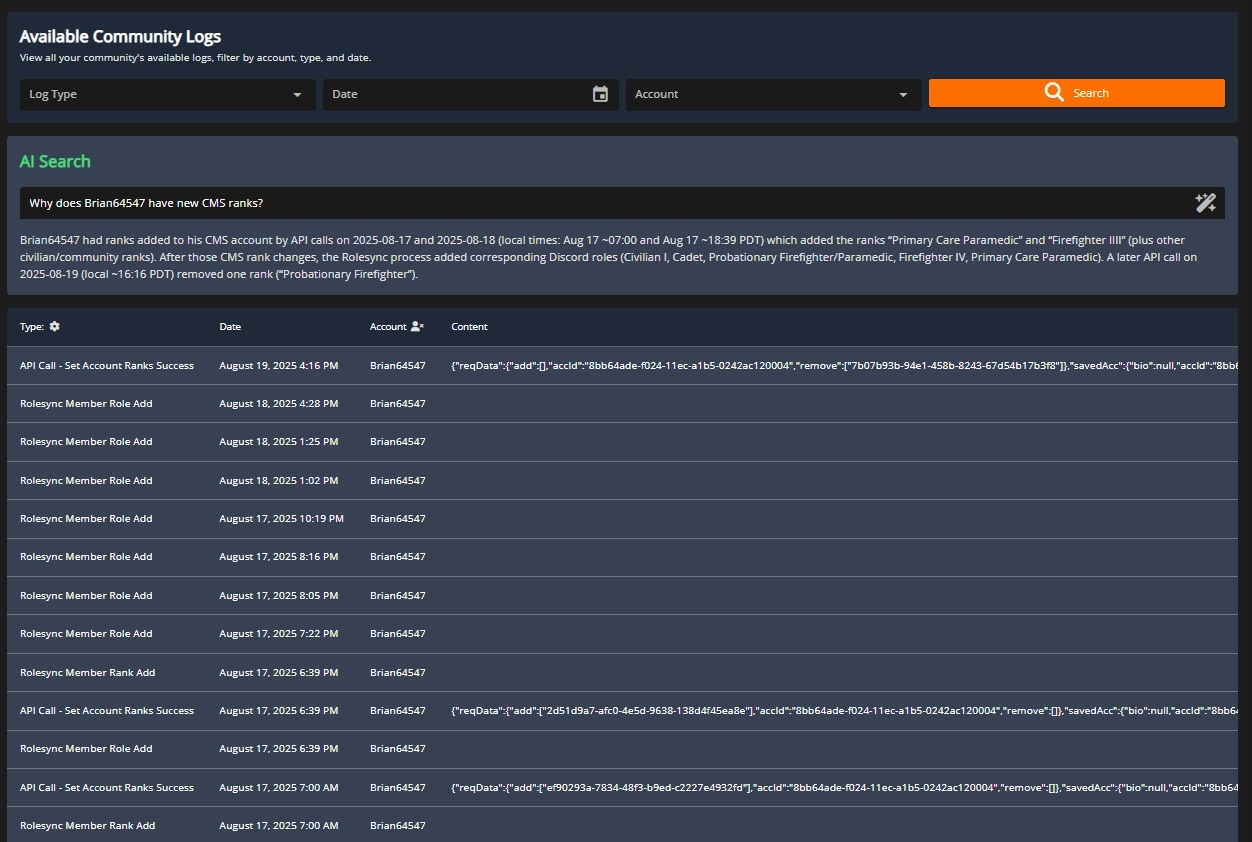 With the large amount of logs to search through, our AI agent can help automatically find relevant logs and provide a summary of the actions. Simply type your question including any details about the username, unique ID, Discord ID, Roblox ID, TeamSpeak ID, or action types to get started.