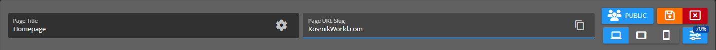 From the website builder's toolbar you can change the page's title, path slug, and privacy setting. Additionally, you're able to add new sections, and change the preview size of the editor to visualize different size settings.