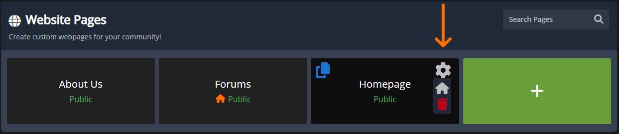 To set a Custom Page as your homepage, navigate to the main page for the Website Builder and look under the section titled `Website Pages`. Locate the page you wish to use as your homepage and press the grey gear icon then the grey home icon, this will turn it orange and set it as the landing page.
