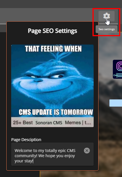 Clicking on the cog on the right side of the `Page Title` box will open the SEO panel. Here you can set a custom image and description for the website's page. These will show in embeds, such as when you paste the link in Discord.