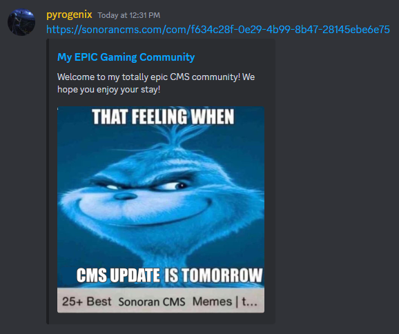 <figure><img src="https://3006847189-files.gitbook.io/~/files/v0/b/gitbook-x-prod.appspot.com/o/spaces%2F-MdBOa9OFjtdqw9FdXli%2Fuploads%2Fgit-blob-6b5c646a26bbb2ed57c62ba7e6e8e9ef47697cdd%2FCMS_PageSEOExample.png?alt=media" alt="" width="289"><figcaption><p>Sonoran CMS - SEO Discord Embed</p></figcaption></figure>