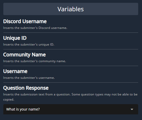 Click the `</>` icon to view available variables. Additionally, copy any form question ID (blue copy button on the question) and use that as a `{variable}` .