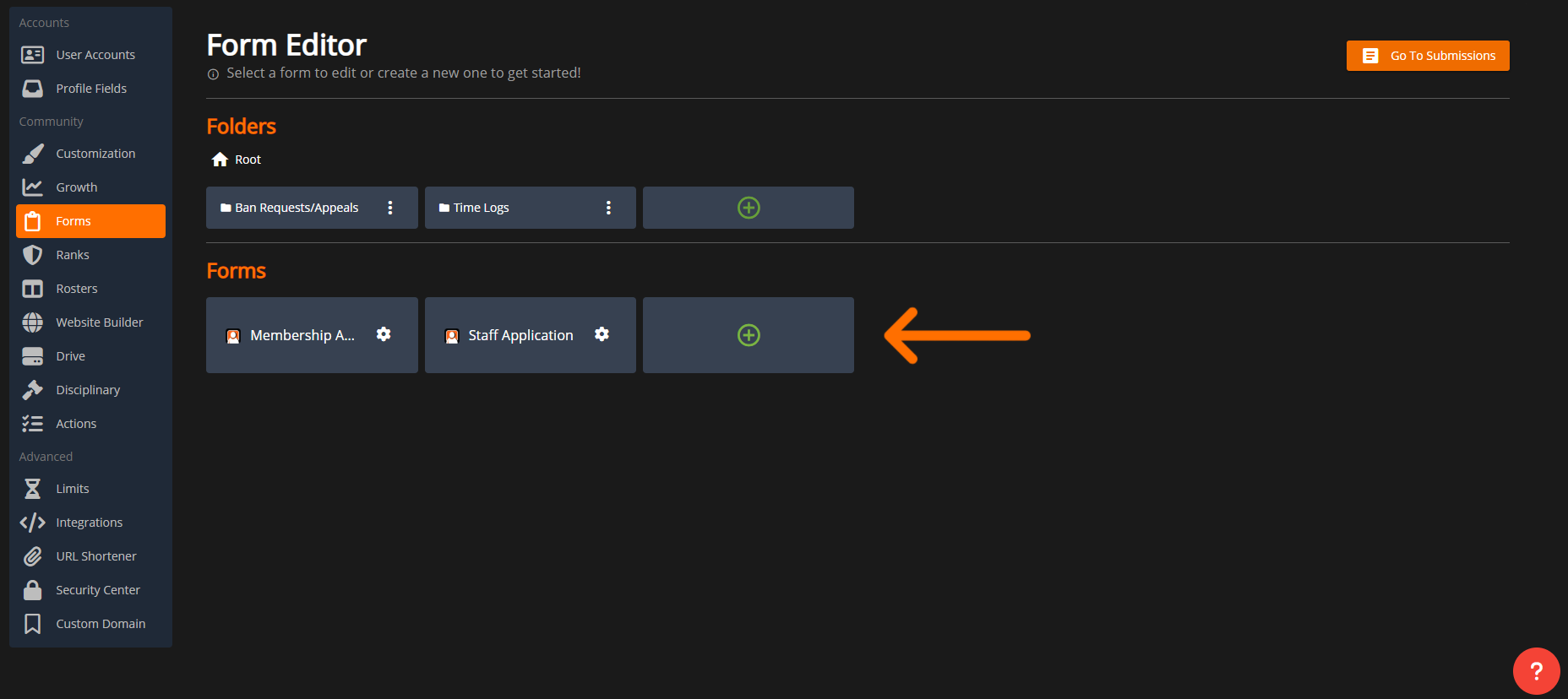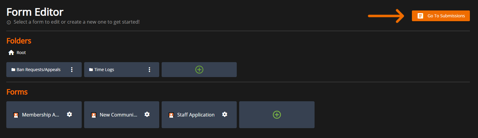 <figure><img src="https://3006847189-files.gitbook.io/~/files/v0/b/gitbook-x-prod.appspot.com/o/spaces%2F-MdBOa9OFjtdqw9FdXli%2Fuploads%2Fgit-blob-93c299c3b26ddd2adbde7ad4ceddf0fbd614e164%2FScreenshot%20(369).png?alt=media" alt=""><figcaption><p>Form Editor: Go To Submissions</p></figcaption></figure>