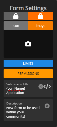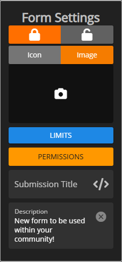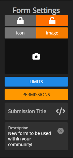 Form settings allows you to lock and unlock submissions, set submission limits, restrict submission permissions, customize the submission board title format, and add a description.