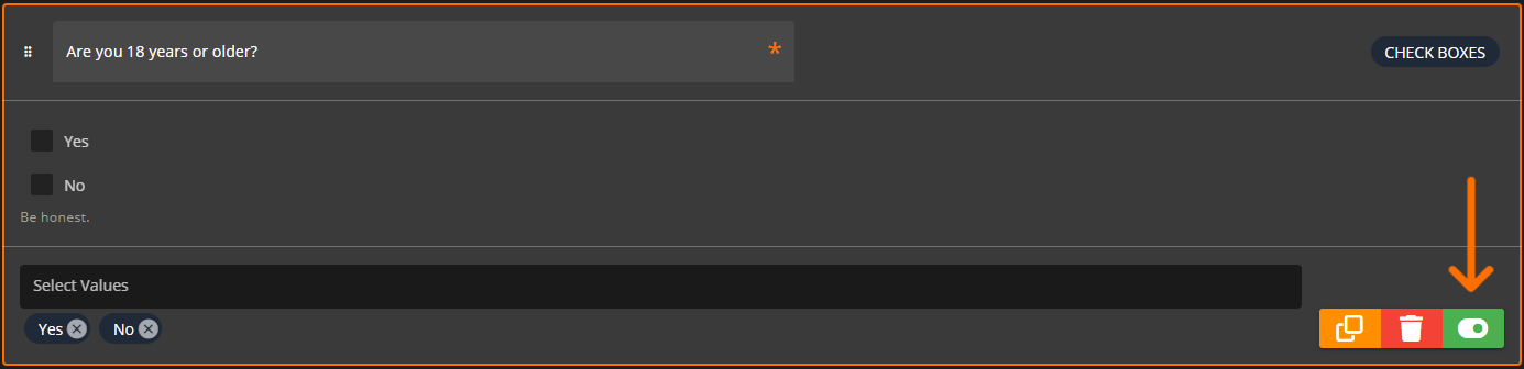 Toggle the conditional section on, select the question it will be conditional on, and enter or select the values that must be met.