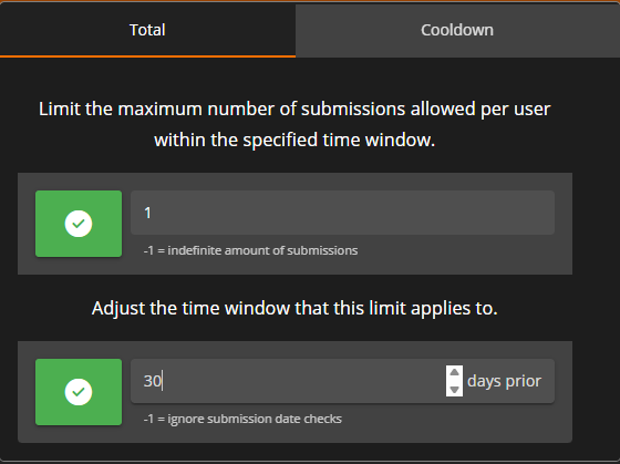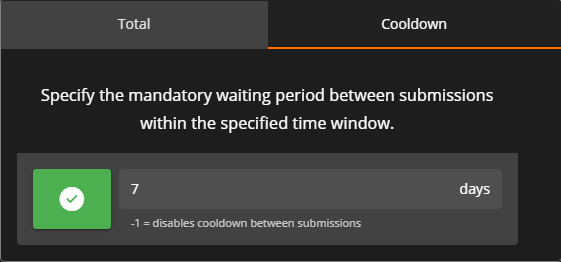 Cooldown: Specify the wait time between submissions within the specified time window.