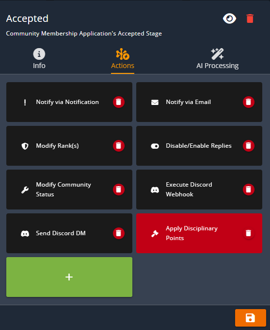 Ex: When changing a user's membership application from `Pending` to `Accepted` you can send them an automated message, apply ranks, and more.