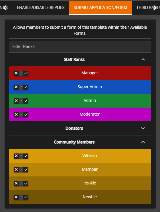 Easily customize what user ranks have access to submit applications, view submissions, change the form stage, and more.