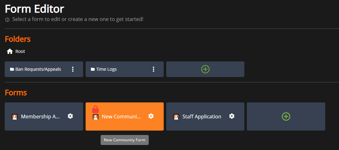 In the `Forms` panel, select the green `+` button to create a new form.