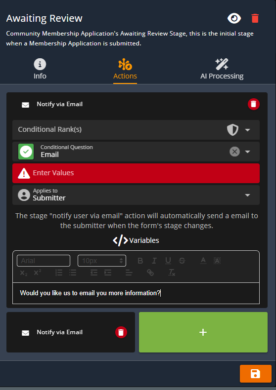 Form stage actions can be conditional, meaning they will only trigger if a certain question response was selected.