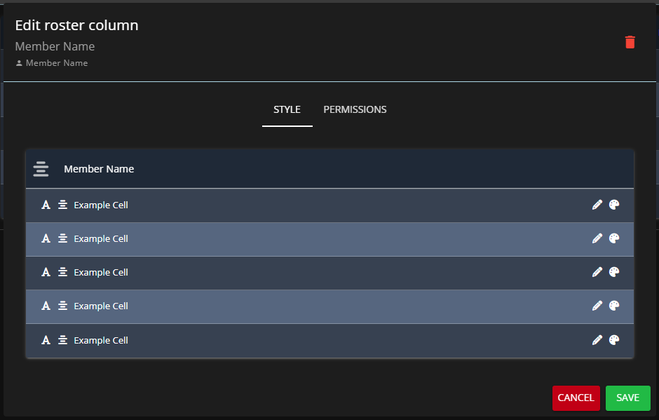For each column in the roster editor, you can customize the styling including text color, background color, font, and alignment, as well as the name of the column itself. You can style the content cells differently from the header cell if you wish.