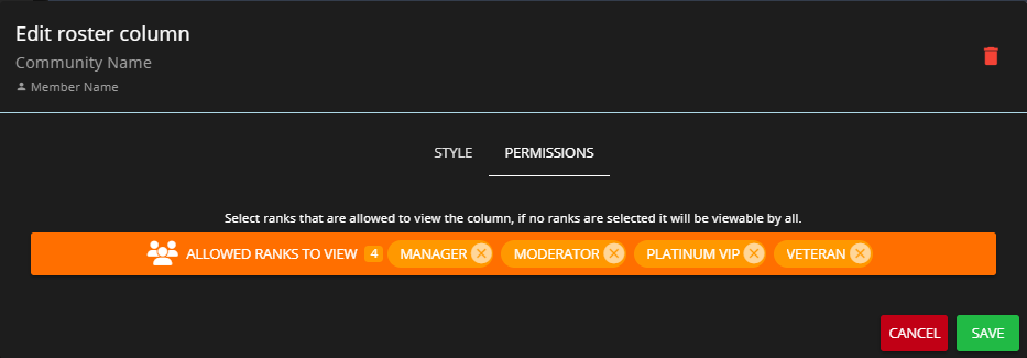 You can also customize the roster's permissions, which determine who is allowed to view and edit it. These permissions apply to the roster as a whole. If you would like to restrict viewing a certain column to only specified ranks, please see [Column Permissions](#column-permissions)