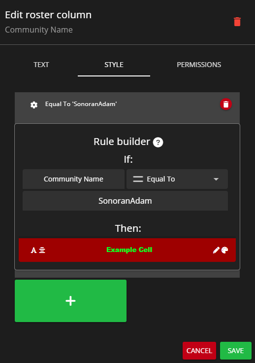 In the `Style` tab, you can use the rule builder to set conditionals that change the style of cells that meet the given criteria. For example, if you have a column for `Community Name`, you can create a style rule where if a user's `Community Name` is `equal to` a certain value, in this example, `SonoranAdam`, then the styling will be what has been set below `Then:`.