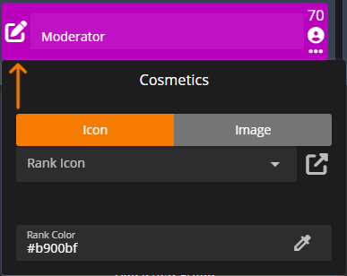 Ranks are able to be customized to the styling that best fits your community. You are able to customize the color and icon associated with each rank. You can specify common color names or custom hex colors. To access this setting, click on the icon to the left of the rank name.
