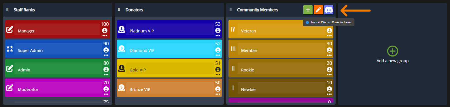 Instead of manually creating rank for everything, you can also directly import the roles from any linked Discord server directly to your CMS Community.
