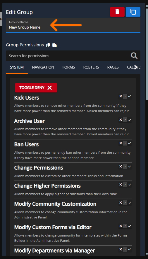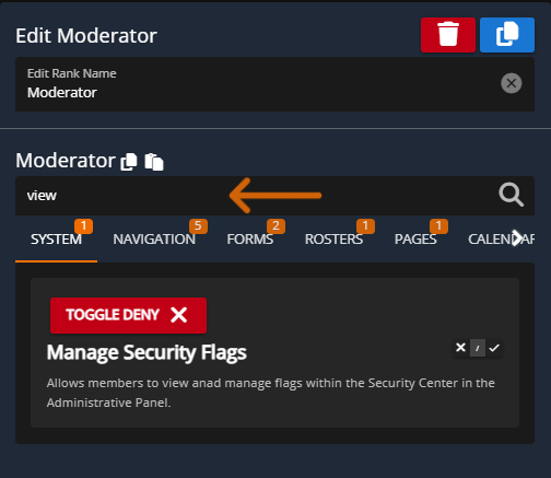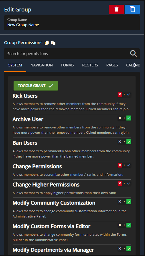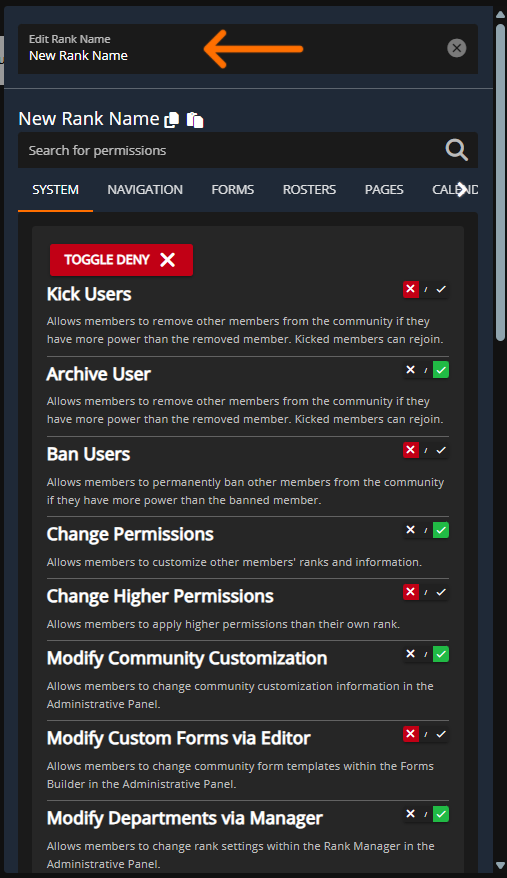 Within the Rank panel you'll be able to create groups and ranks for your members, this will be the central panel for deciding permissions based on "ranks", when new, removed, or modified Custom Forms, Calendar Categories, and Rosters will be reflected with available permissions under each rank.