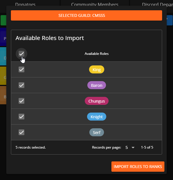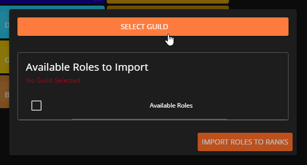 When you select a guild to import roles from, it will populate the window with all existing roles within that Discord. You can select which roles you would like to import, or click the top checkbox to select all.