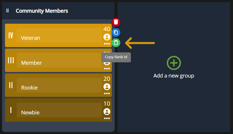 In the group header, click the green plus button to begin creating a new rank