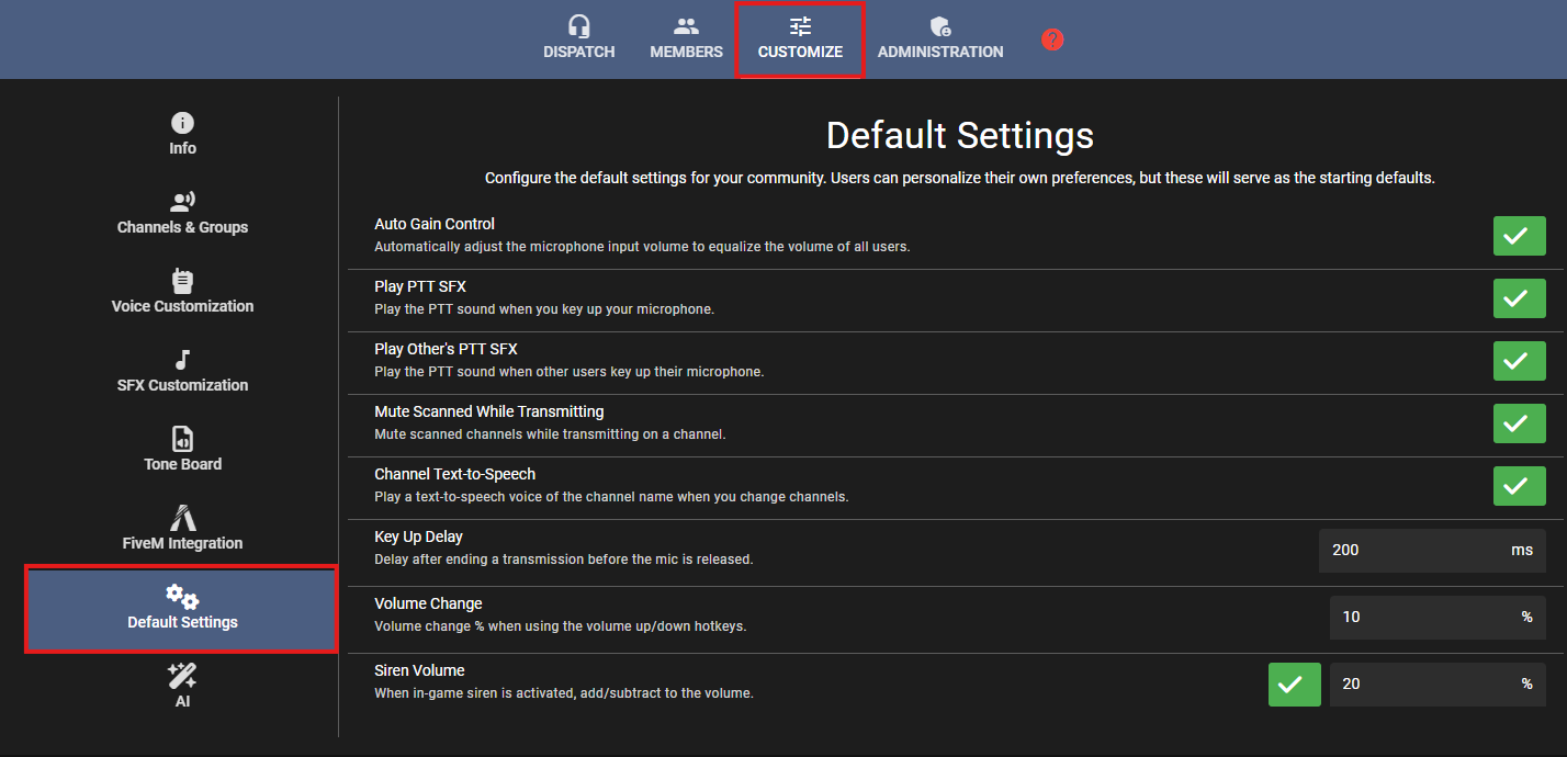 The radio settings menu offers vast preference options for sound effects, text-to-speech, automatic gain control, and more. Some communities may wish to enable or disable specific settings for users by default.