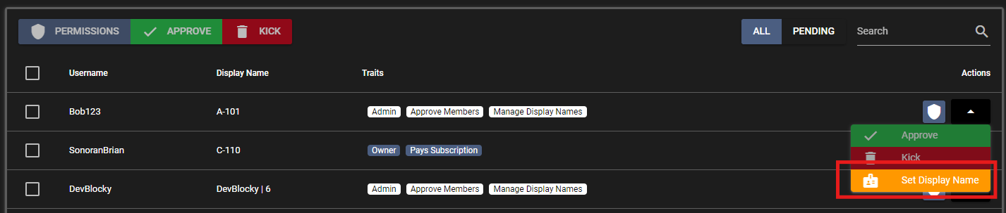 In the admin panel's `Members` tab, select the drop-down and `Set Display Name` button to edit a user's display name.