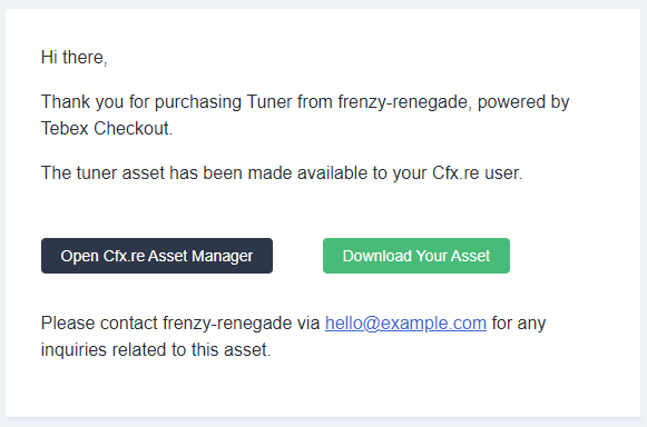 After completing your purchase you should receive an email similar to the following. From this email you can simply click the Download Your Asset button to download the zip file containing your asset. After you've downloaded your asset please proceed to the install documentation for the script you've downloaded.