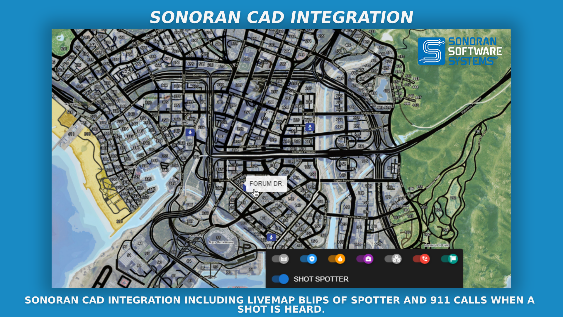 <figure><img src="https://954277862-files.gitbook.io/~/files/v0/b/gitbook-x-prod.appspot.com/o/spaces%2FA1LA3ay59CDyDKnfXPfc%2Fuploads%2Fgit-blob-059f856f4f13e09caebc84f63dae5a89b108a751%2Fss-in-game-blips.png?alt=media" alt=""><figcaption><p>Sonoran Software - Shot Spotter Promotional Image</p></figcaption></figure>